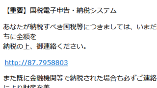 外国から迷惑メール【重要】国税電子申告・納税システムというタイトルでメールが届いたらニセモノ